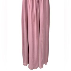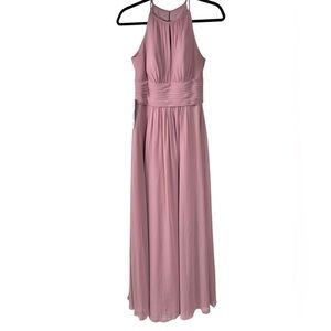 Bonnie is a floor-length chiffon bridesmaid dress in an A-line cut, in Dusty Pink. This is a Small Custom Size. Bonnie features a halter neckline with a unique key-hole front & back, ruched waist band. Fully lined.