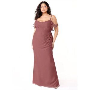 Azazie Emeralda style dress in colour Amethyst, size A12. "Emeralda is our timeless bridesmaid dress crafted from chiffon. She features a stunning pleated bodice paired with romantic off-the-shoulder ruffles, leading to a draped cowl back. The look is complete with a floor-length sheath skirt."