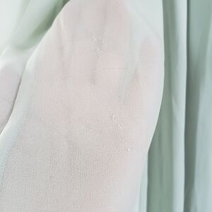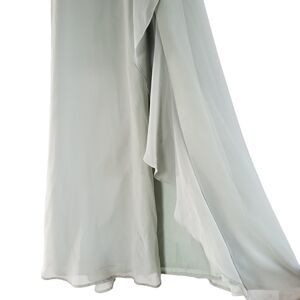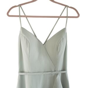Elegant sage green maxi dress. Features a V-neckline and spaghetti straps. Flowing skirt with a side slit. Perfect for formal occasions.