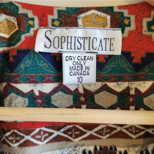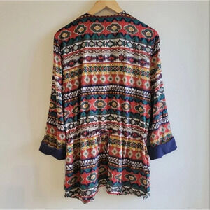 Aztec inspired fabric with a geo twch design. Tie string on backside to adjust jackets fit. 3/4 length sleeves with rolled cuff. Side split on seem.