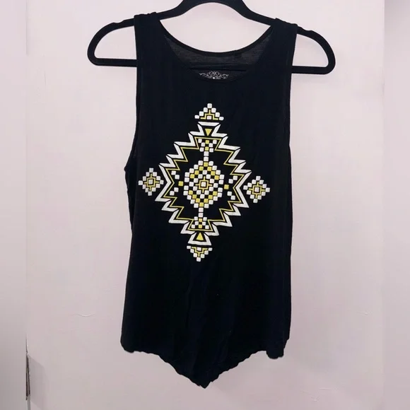 Chic black tank top with a bold Aztec pattern. Ideal for adding a stylish touch to your casual wardrobe. Handkerchief hem.
