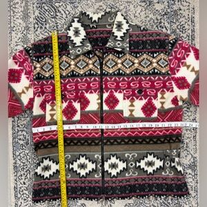 Stylish jacket featuring an Aztec pattern. Includes a front zipper and two pockets. Vibrant colors for a bold look.