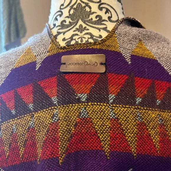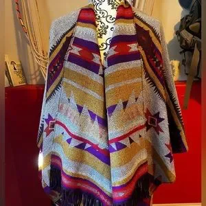 Never worn, soft, flowy, Aztec poncho. Purple, yellow, red, grey. One size will fit all.