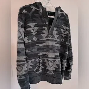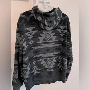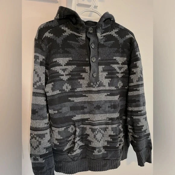 Men’s size small (would fit women’s medium) bold Aztec/geometric print hooded sweatshirt with buttons down the top. In great condition.