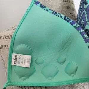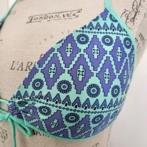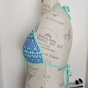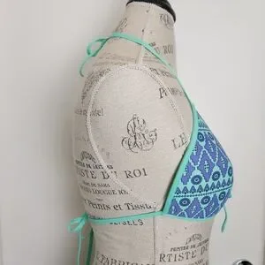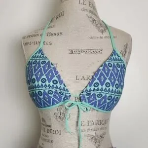 Aquamarine & Periwinkle Blue Aztec Floral Print Triangle String Bikini Swimsuit Top with adjustable Bowtie front, by Eidon.