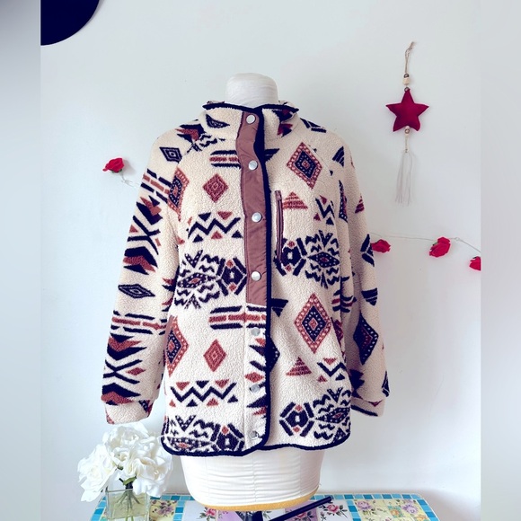 Aztec Tribal Cream Brown Sherpa Coat Shacket L