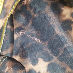 Vintage B. Makowsky mustard yellow large soft leather satchel. Flap pocket on front with magnetic closure. Outer open pocket on back of bag. Ruched sides. Magnet closure with Interior zippered pocket in middle. One side has another zippered pocket with two open. Measures 16 x 12 x 5 inches.