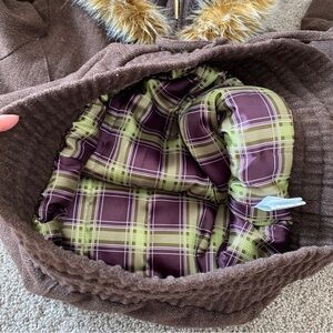 Features faux fur hood, zipped kangaroo pocket, back pocket, drawstring waist