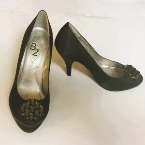 B2- BLACK SATIN PUMPS WITH JEWELED APPLIQUE ON TOE