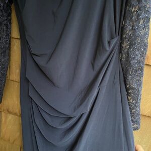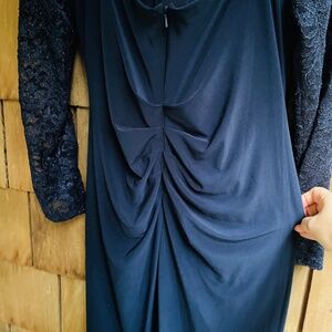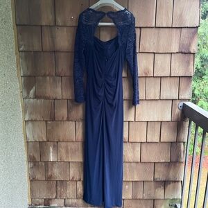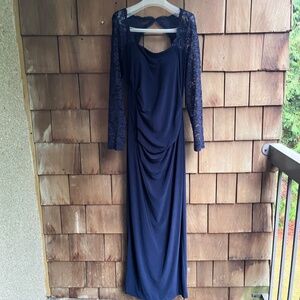B&A By Betsy & Adam Lace-Sleeve Square-Neck Gown Women's 14 Navy Zip Closure~