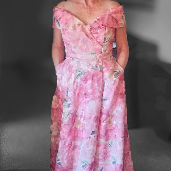 Beautiful floral floor length gown with pockets. Vibrant rose print, fit and flare silhouette. Brand new with tags. Size 10, but fits more like size 8. Extremely comfortable with Lightweight, fluid fabric. Off-the-shoulder crossover neckline and Cap sleeves. Highest shoulder point: 62"