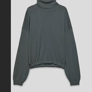 This is a blouson-style turtleneck with a foldover collar, elastic waist and dropped shoulders. It's knit with all-season LENZING™ ECOVERO™ Viscose.