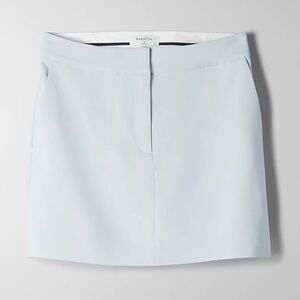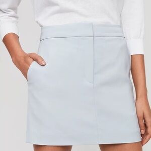 This high-waisted mini has a contour waistband and trouser-style front slash pockets. Fly zip closure with faux welt pockets at the back.
