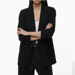 Open blazer with a shawl collar, ruched sleeves + shoulder pads. Tailored with Terado a Japanese fabric that's matte crepe on one side and satin on the other.