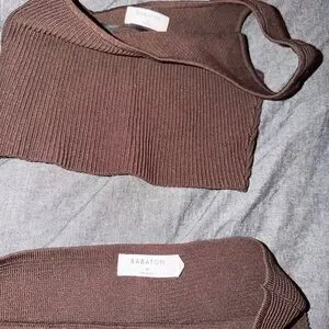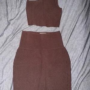 Stylish ribbed skirt set in a rich chocolate hue. Features a sleeveless top and high-waisted skirt. Perfect for versatile wear. Like new - never worn. Shirt is an XS but is stretchy