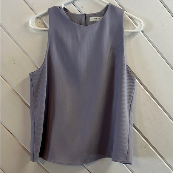 Lightweight ribbed textured tank with button closure at neckline. Colour is blue-grey with some lilac undertones. Perfect for layering.
