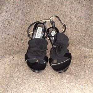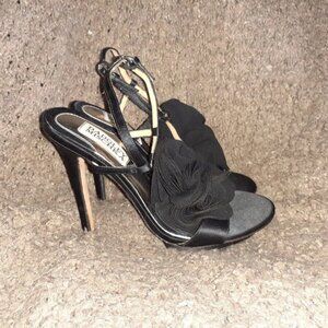 BADGLEY MISCHKA-Randee-Silk/Satin Black Flower-4.5" Heels-Sz 5.5-Excellent