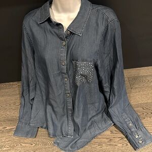 💙🤍Stunning Elegant dressy casual chic style, rhinestone embellished pocket detail denim button down shirt with collar. New with tags approx measurements photographed. Same day shipping from smoke free home