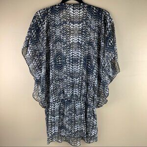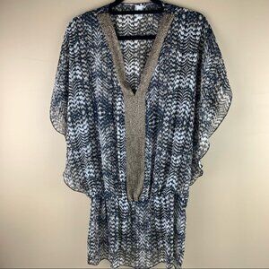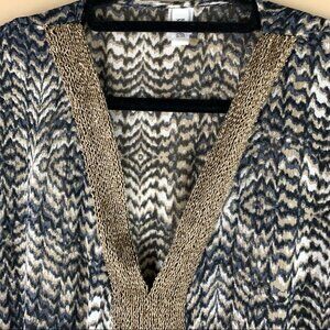 Print black, grey, tan with gold beading down the front, beach coverup. 100%polyester. Gathered waist. Sheer flowing and feminine.