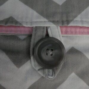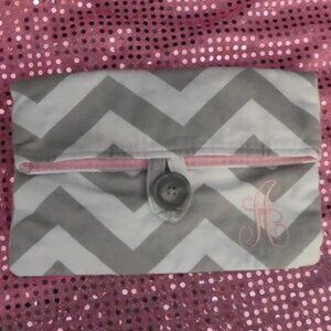 Stylish grey and white chevron pattern clutch with a pink trim and button closure