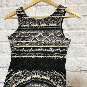 Features: Skater Style, Lace Insert on Waist, Sleeveless, Geometric Print, Mini Length