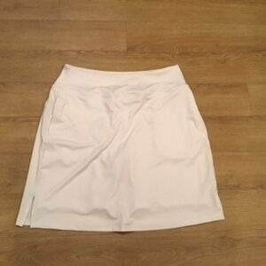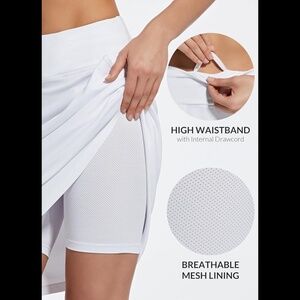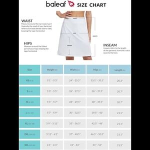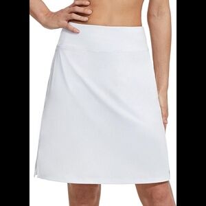 Brand new Baleaf women’s size XL (size chart in photos) white knee length golf/tennis skort. Knee length offers more coverage, which is modest & comfort. Build-in mesh liner shorts and non see through & non roll & breathable. Tow side pockets for storing you phone and 1 waist hidden pocket for your keys. Adjustable inner drawing provides elasticity.