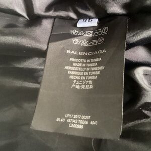 Men’s Black BALENCIAGA “Sinners” bomber jacket with stand up collar, satin interior lining, dual flap pocket at sides and zip closure. The first photo is a stock photo not of actual jacket. The rest of photos are the jacket.