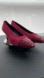 Bally all leather burgundy low heel pumps are made in Italy. They are mainly suede with a diamond cutout pattern toe cap in patent leather and suede. Metallic interior. Pointed toe.