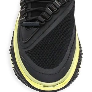 From the Balmain x Maluma Capsule Collection. This chunky mixed media design features a combination of knits, mesh, and leather with sock like shaft and wrap-around lacing.