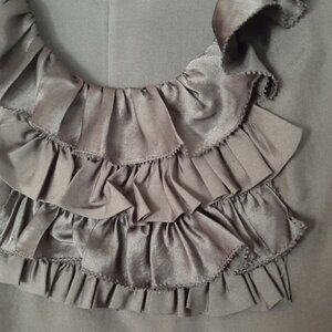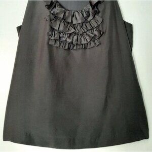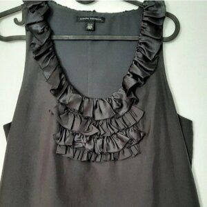 • Elegant sleeveless light scoop neck shell top in black with ruffled bib detail. Its stylish design adds a touch of sophistication to your wardrobe.