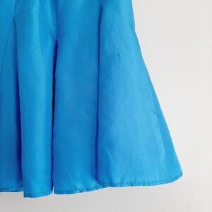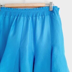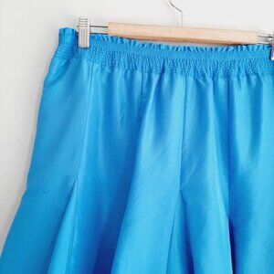 • Pleated pull-on mini skirt in solid blue with elastic waist band. Lined.
