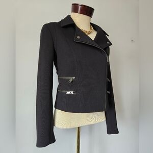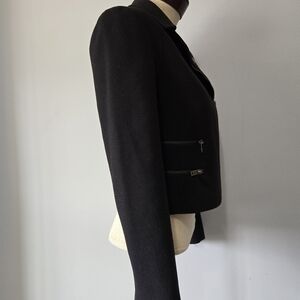 Adorable fitted cropped jacket with zippered details. Tiny usable front pockets. zippered sleeves. Full front asymmetrical zipper. Folded collar. Fully lined un a silky black