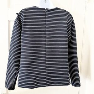 Stay cozy and stylish in this soft, thick knit Banana Republic top, perfect for cool weather or layering. Designed with a loose, relaxed fit, this piece features a round neckline with an elegant bow detail, long sleeves, and a zippered back for easy on and off. The navy and white stripes give it a classic, nautical vibe.