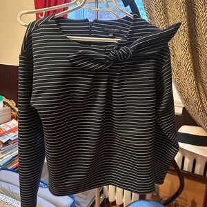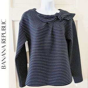 Stay cozy and stylish in this soft, thick knit Banana Republic top, perfect for cool weather or layering. Designed with a loose, relaxed fit, this piece features a round neckline with an elegant bow detail, long sleeves, and a zippered back for easy on and off. The navy and white stripes give it a classic, nautical vibe.