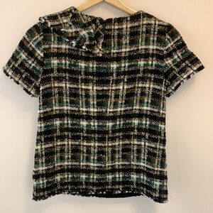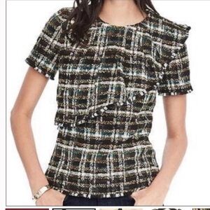 BANANA REPUBLIC CLARENSON the finest French tweeds, tweed top with ruffle overlay, fully lined, back zipper, black blue white wool blend tweed, size 2. This top is stunning- heavy material, like a coat but in a top.