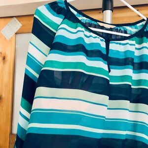 Banana Republic Factory Blue/Green/White Stripes Lightly Sheer 3/4 Sleeve Scoop Neck Peasant Blouse Sz M