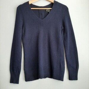 • Long sleeve fine knit pullover V-neck top in dark, navy blue with button back detail. Made with fine Italian yarn.