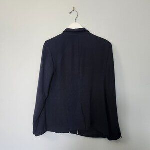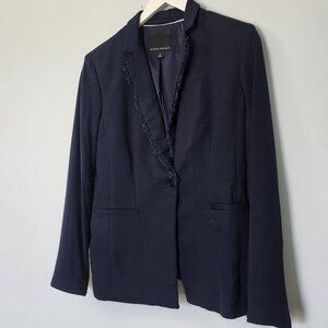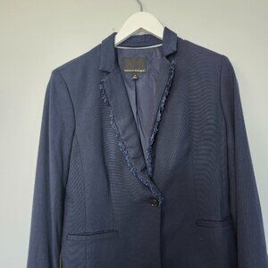 Navy Banana Republic fray trim blazer. Fully lined. Faux pockets. Gently loved. Some signs of wear on the sleeve (see photos).