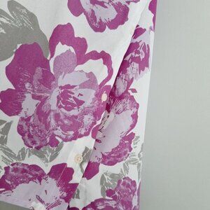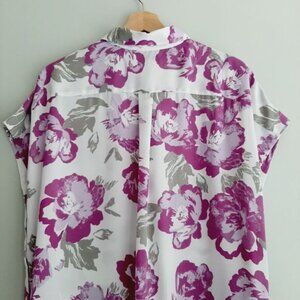 • Boxy, lightweight button down blouse top in white with large grey and purple flower pattern.