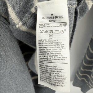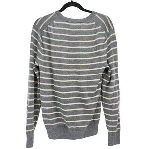 Classic striped crew from Banana Republic knit with 100% extra-fine Italian merino wool (tag: “Italian Merino Yarn / Baruffa”). Soft, lightweight and breathable—great for layering year-round. Heather gray base with cream horizontal stripes, ribbed collar/cuffs/hem, raglan sleeves.