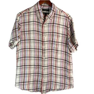 Mens tan multicoloured plaid Banana Republic 100% Linen Plaid Button Down Shirt.
