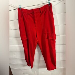 Bright red cropped cargo pants by Banana Republic made with eco-friendly LENZING™ ECOVERO™ fabric. Relaxed fit with multiple pockets and ankle-length tapered legs. A perfect mix of comfort, function, and sustainability. Size 16. Excellent condition.