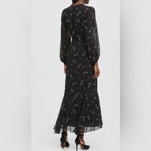 BANANA REPUBLIC Sz 8 Floral Faux Wrap Maxi Dress Ruffle Balloon Sleeve Sheer Lined. Elegant black wrap dress with a floral pattern. Perfect for any occasion. Party, event, wedding guest, date night or because you love to look lovely and feminine.