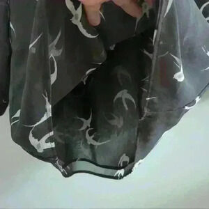• Style: Pullover, keyhole back with button and loop, 3/4 length sleeves, button up cuffs, sheer material with front being less sheer, oversized fit