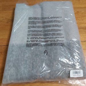 No longer comes with plastic bag shown in photo. Material/care tag cut off.