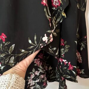 Elegant black dress with vibrant floral patterns, perfect for any occasion. This dress is lined! Has a pocket to keep the top of the wrap closed at the bust!