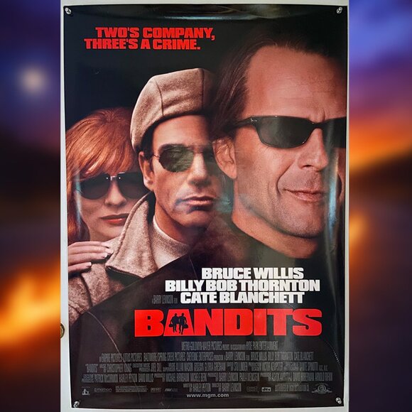 A slick, fun early-2000s crime-comedy one-sheet, this is an authentic, original theatrical movie poster for Bandits (2001), starring Bruce Willis, Billy Bob Thornton, and Cate Blanchett. The bold design features the trio in sunglasses with the punchy tagline “Two’s company, three’s a crime.” above the bright red title treatment. This poster is double-sided (made for theatre lightbox display), not a reproduction, and a great collectible for fans of heist movies, star collectors, or anyone building a standout wall of 2000s cinema posters.