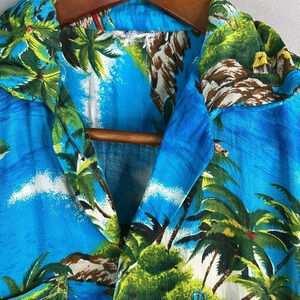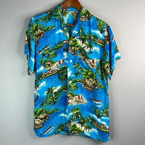 BANEE Vtg Camp Collar Shirt Blue Tropical Print Short Sleeve Rayon Hawaiian S