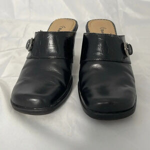 BARETRAPS Vivid Black Leather Chunky Heeled Mules Croc Effect Square Toe Size 6