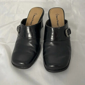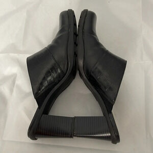 Women’s black BareTraps “Vivid” Genuine Leather Upper Chunky Heeled Mules.